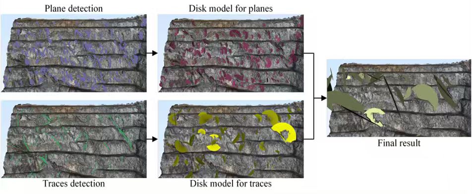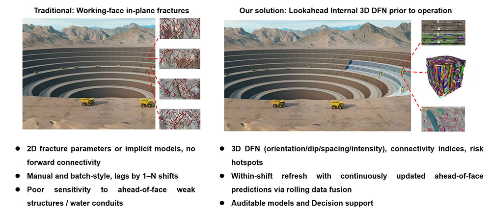 Traditional open-pit face mapping is slow (1–3 days/face), subjective, and lacks predictive capability—leaving risks like weak structures or water conduits undetected. We automate face point cloud processing by normalization and feature extraction via dual-head "Plane+Trace" fusion models, generating design-ready fracture sets/trace maps in ≤2 hours per face. With ≥95% accuracy and real-time rolling data fusion, we build lookahead 3D-DFN models—outputting fracture orientation, risk hotspots, and connectivity indices to enable pre-operations adjustments such as optimizing blasting to avoid slope instability. This shifts geological work from "post-event analysis" to "pre-event prediction": boosting slope safety, improving resource recovery, and cutting costs by 25%+ vs. mainstream software. Our auditable trail (model versions, data lineage) further ensures reliability for safety audits.