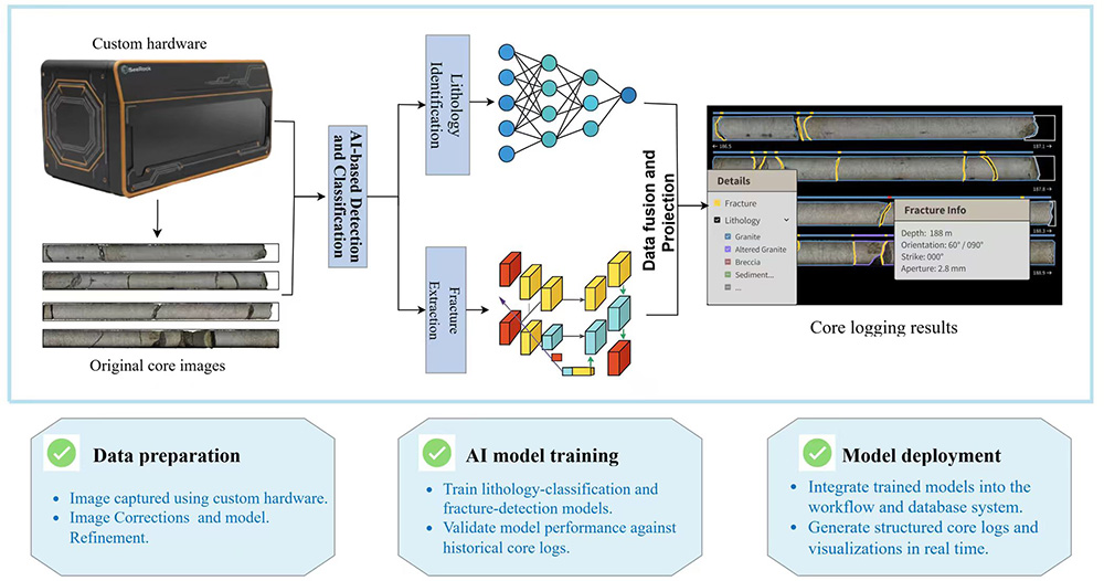 Traditional core logging relies on manual observation, high labor costs, slow batch processing, and poor data consistency block timely production links. We provide end-to-end AI system solutions. Custom hardware captures high-res core images, which we correct and analyze via dedicated lithology-classification and fracture-detection models. We deliver structured logs including RQD/RMR/Q values and fracture angle/aperture data, support real-time visualizations in ≤2 hours per batch, with ≥95% accuracy. The structured data seamlessly connects to mining design software (e.g., RQD values for stope support design), eliminating rework. We cut labor costs by **40%+** vs. manual workflows and avoid high license fees of other tools—while ensuring consistent, auditable results for geological decision-making.